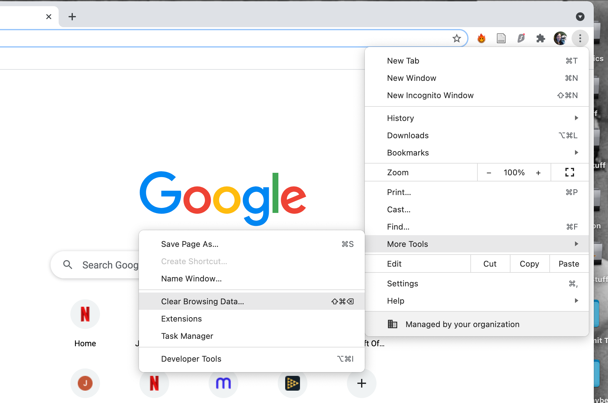 To remove your browsing data, open Google Chrome and click on the three dot menu icon. Then click on More Tools > Clear Browsing Data. You can also use the keyboard shortcut Shift + Cmd + Delete.